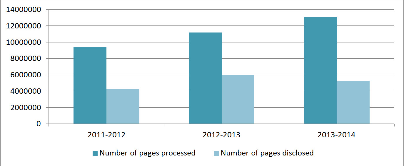 Across government, approximately 20% of pages disclosed are in the “all disclosed” category (1,052,434 of the 5.3 million pages). This rate was 12% in 2011–2012 and 24.5% in 2012–2013.