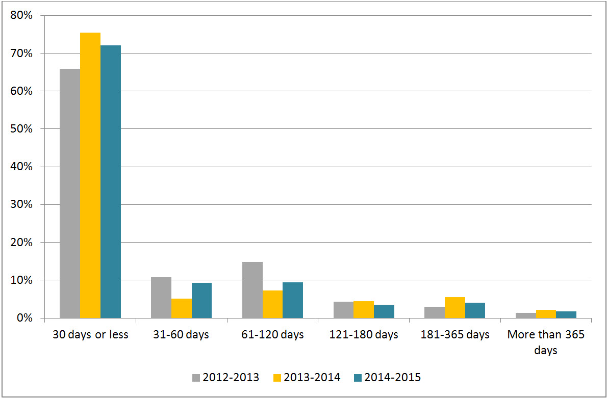 Figure 2 shows that 37.5% of the extensions taken in 2014-2015 were for 30 days or less. This is a slight reduction of 1.5% from 2013-2014. Figure 2 also shows that the proportion of extensions taken between 31 and 60 days in 2014-2015 increased by 11.8% compared to 2013-2014. No extensions of more than 120 days were taken, as opposed to the previous period, where two extensions were taken between 181 and 365 days.