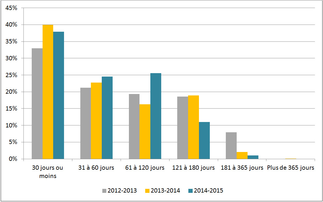 La figure 2 démontre que 37,9 % des prorogations étaient de 30 jours ou moins, soit 2,0 % de moins qu’en 2013-2014. On constate également que le nombre de prorogations de 31 à 60 jours en 2014-2015 a augmenté de 1,8 % par rapport à la période précédente.