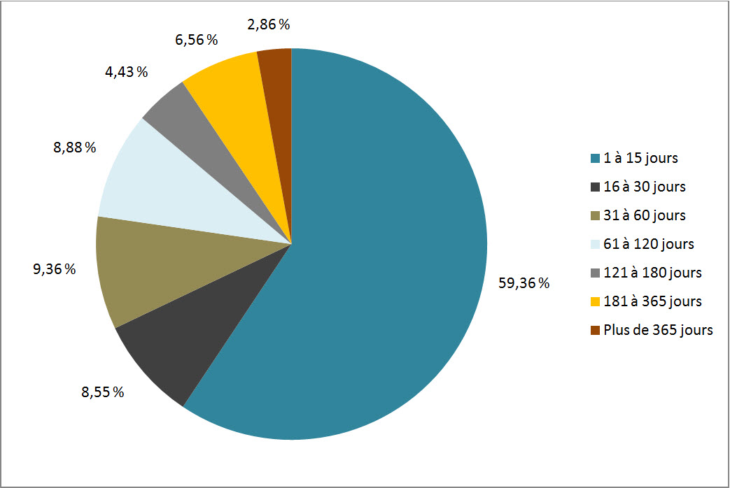 La figure 3 montre que 59,4 % des demandes échues étaient en retard de 15 jours ou moins, 8,6 % des demandes étaient en retard de 16 à 30 jours et 8,9 % étaient en retard de 61 à 120 jours; 2,9 % des demandes échues ont pris plus de 365 jours à traiter. En 2013-2014, 53,3 % des demandes échues ont été traitées dans un délai de 15 jours.
