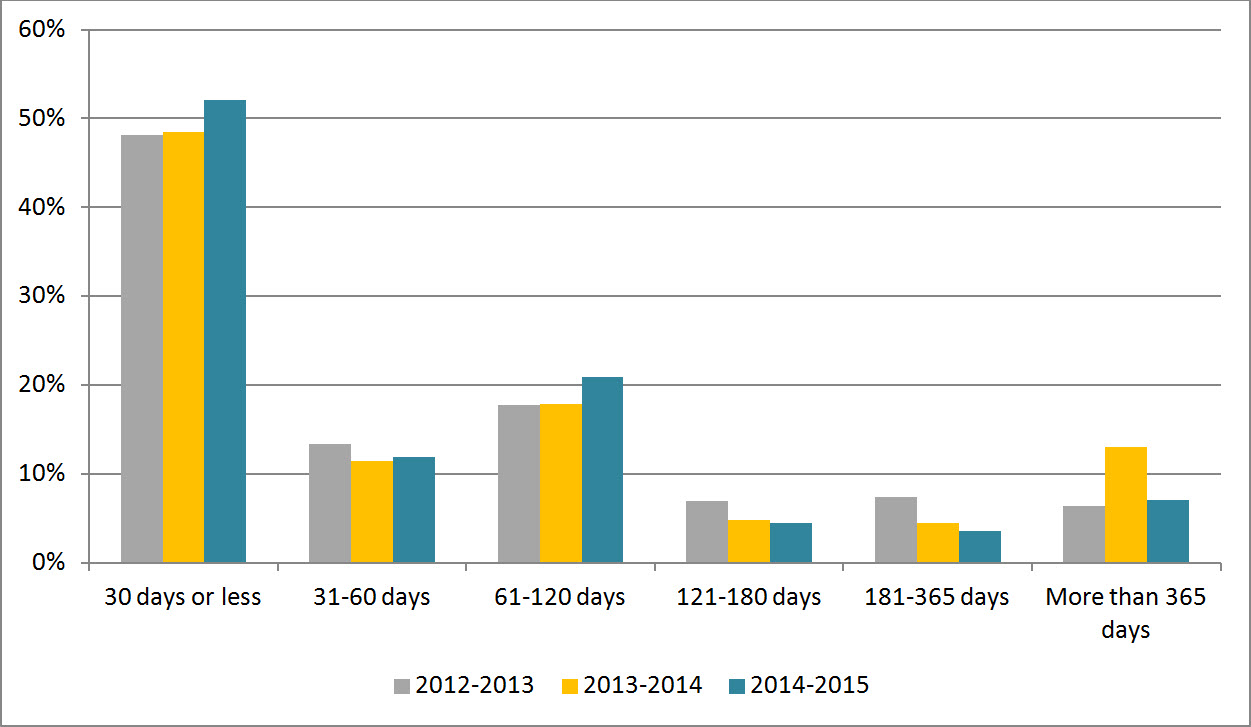 La figure 2 montre que 13,3 % des prorogations en 2014-2015 étaient de 30 jours ou moins, un résultat légèrement supérieur (0,7 %) par rapport à 2013-2014. La figure 2 montre également que le nombre de prorogations de 31 à 60 jours a augmenté de 8,6 % par rapport à 2013-2014. Dans toutes les autres catégories, la durée des prorogations a diminué, à l’exception de la catégorie de 181 à 365 jours, où aucun changement n’a été observé.