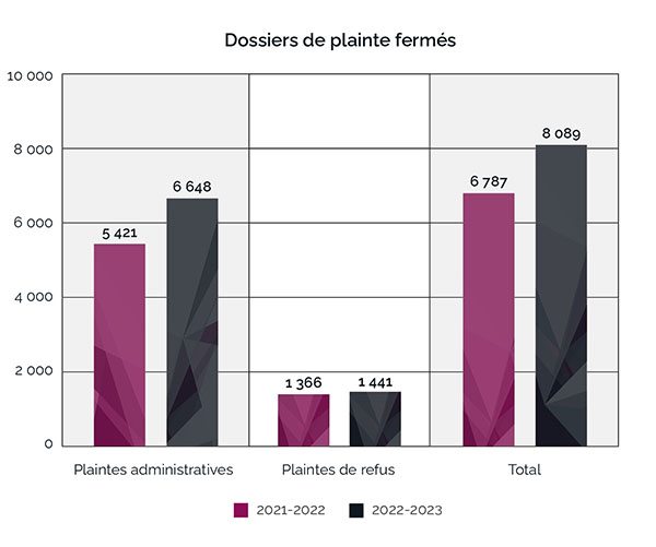 Les résultats atteints au cours des douze derniers mois parlent d’eux-mêmes. Devant une hausse constante du nombre de nouvelles plaintes déposées au Commissariat, ce dernier est parvenu à en suivre le rythme et a même surpassé le record établi l’année dernière en fermant plus de 8 000 dossiers en 2022-2023.